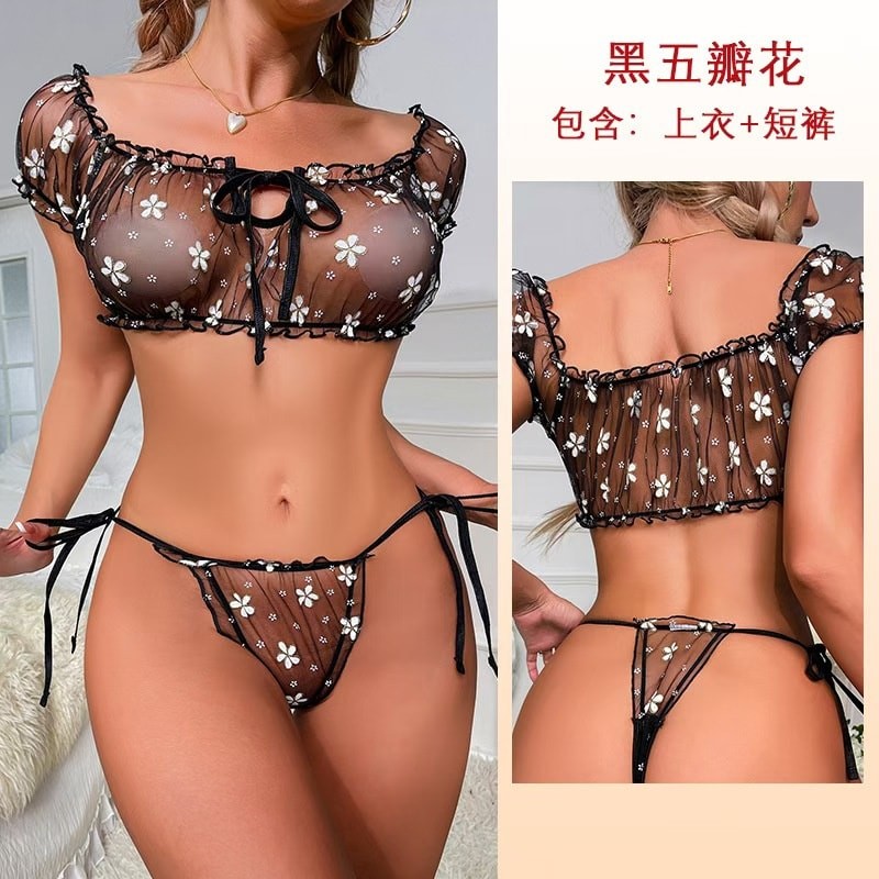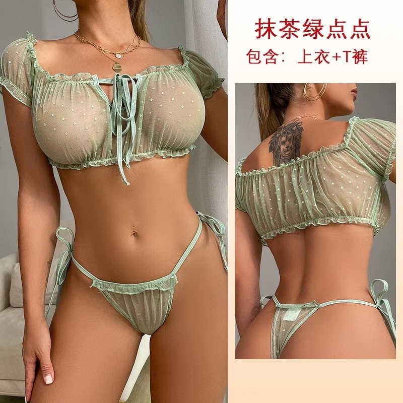 Summer Sexy Polka Dot Mesh Lingerie Strapless Off-Shoulder Tie Sleepwear One Size Panty & Bra Set
